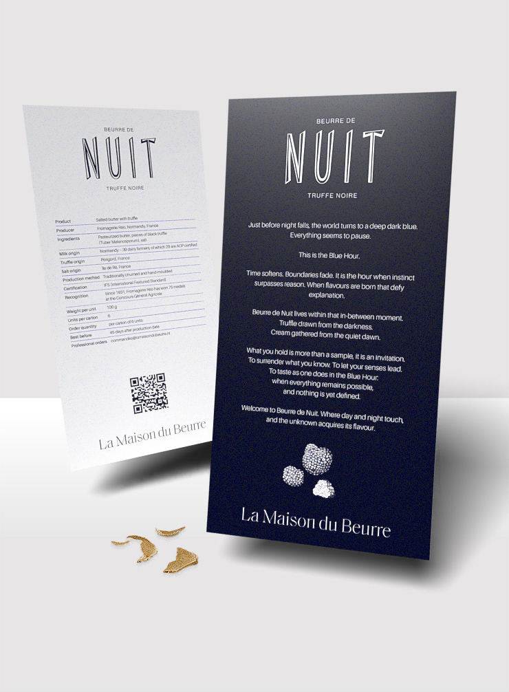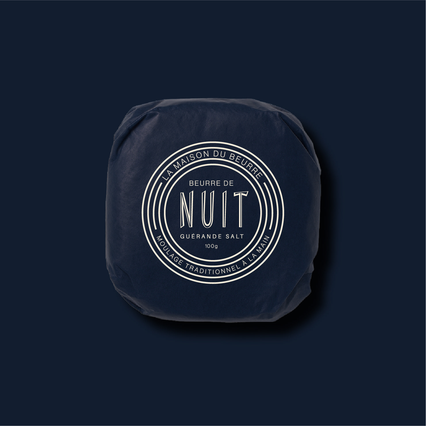 Beurre de Nuit pivots from the blue hour concept, a salted butter with truffle. A beautiful example when day and night seams to merge. Cream gathered from the quiet dawn, and Truffle found in darkest night.